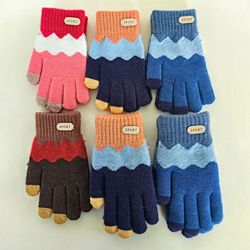 Guantes tejidos para estudiantes, invierno, lana cálida, patrón de ondas de cinco dedos, mitones falsos de terciopelo de una sola capa para niños