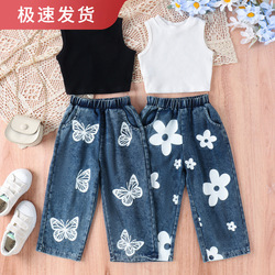 Trẻ Em Quần Áo Thiết Lập Mùa Hè Phong Cách Giản Dị Cho Cô Gái Top & In Jeans Châu Âu Mỹ Gân Rắn Màu Sắc Cho Trẻ Mới Biết Đi